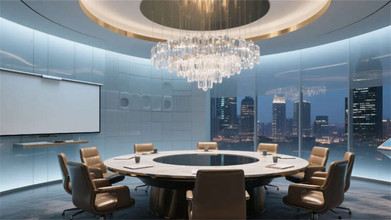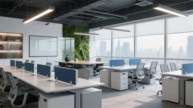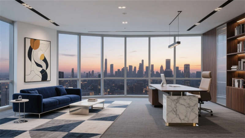 入口處弧形接待臺似律法天平,發(fā)光企業(yè)標(biāo)識懸浮于透光大理石背景墻,線性燈光如正義之軌延伸至開放式辦公區(qū)。玻璃幕墻外合肥城市天際線成為動態(tài)畫布,智能升降桌與模塊化工位詮釋高效協(xié)作。合伙人辦公室的270°環(huán)景視野,將巢湖煙波與都市繁華收于案頭,霧化玻璃在私密與開放間自由切換。