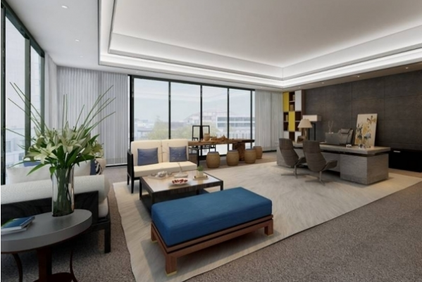 總經(jīng)理辦公室采用落地窗的形式將空間在視覺上向外擴(kuò)展,同時(shí)增加視野的廣度,在工作間隙中觀賞一番自然之景,疲勞盡可除去。為了緩解公辦空間彌漫的焦慮感,在整體布局上,設(shè)計(jì)師更多地朝著簡(jiǎn)約靠攏,但絕不僅僅只是如此,在這個(gè)空間中,我們可以看到裝修風(fēng)格的多重交叉,局部呈現(xiàn)出簡(jiǎn)約的風(fēng)格,但該有的一個(gè)都不會(huì)少: 大沙發(fā)群、小品茶區(qū)、主體辦公桌、書架及展示柜等。