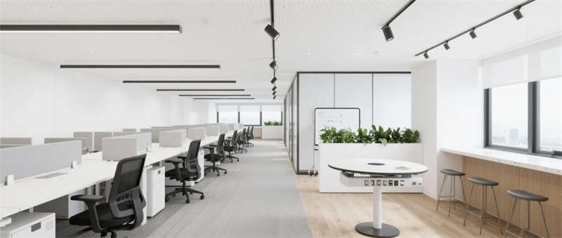 高管辦公室通過灰玻霧化膜實現(xiàn)私密與通透的辯證,胡桃木辦公桌與深灰沙發(fā)組演繹商務(wù)美學(xué),隱藏式智能控制系統(tǒng)將科技感融于無形??萍紩h室創(chuàng)新采用環(huán)形桌體與360°攝像系統(tǒng),陣列麥克風與補光燈帶打造沉浸式遠程協(xié)作場景。從光伏玻璃幕墻到模塊化綠植系統(tǒng),從智能升降辦公桌到節(jié)能設(shè)備集群,每個細節(jié)都銘刻著可持續(xù)發(fā)展的空間基因。
