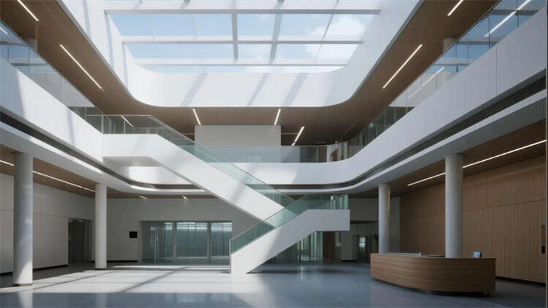 空間內(nèi)核強(qiáng)調(diào)人性化體驗(yàn):挑高中庭以懸浮樓梯創(chuàng)造輕盈動(dòng)線,屋頂花園成為員工觸摸自然的窗口;無柱車間與智能實(shí)驗(yàn)室展現(xiàn)工業(yè)精密感,而木格柵連廊與綠植墻則注入人文溫度。夜幕降臨時(shí),建筑化為光影容器,冷白光帶勾勒結(jié)構(gòu)輪廓,暖黃窗格透出工作場(chǎng)景的活力。