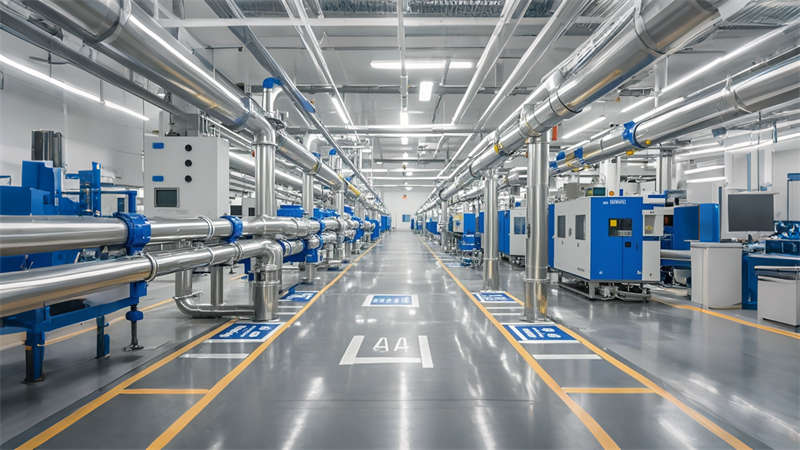 3) 色彩策略運用冷色調(diào)提升作業(yè)專注度,暖色點綴緩解視覺疲勞。材料選擇上,金屬格柵、清水混凝土與環(huán)氧地坪的搭配兼顧耐用性與美學表達,集成式 LED 照明系統(tǒng)實現(xiàn)能耗降低。該設計在滿足 ISO 生產(chǎn)標準的同時,通過人性化休息區(qū)與智能管理系統(tǒng),打造現(xiàn)代制造業(yè)空間新標桿。