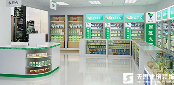 2.店內(nèi)的裝潢設(shè)計(jì)-藥店的裝潢設(shè)計(jì),要滿足視覺的體驗(yàn)。顏色不宜太亮,也不宜太光明了,一般以簡(jiǎn)潔明了來滿足大家了;藥店對(duì)店鋪層高的要求一般在3米以上,但由于所選擇的店面多數(shù)處于底層,天花板下多數(shù)有下水管、電線管、消防管等管道,這時(shí)不要安裝吊頂天棚將這些管道隔離,只要這些管道粉刷成純白色,并將光源置于管道之下即可,這樣既可以保證商店的空間,又可以節(jié)省費(fèi)用。