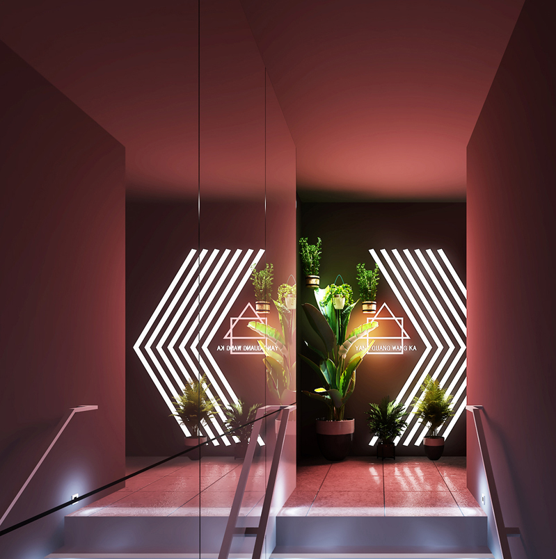 電競氛圍的營造不是單一的,而是無處不在。樓梯入口處醒目而又充滿趣味的燈帶指示標(biāo),巧妙的標(biāo)識著空間的轉(zhuǎn)角,入門處便有一種電競感。