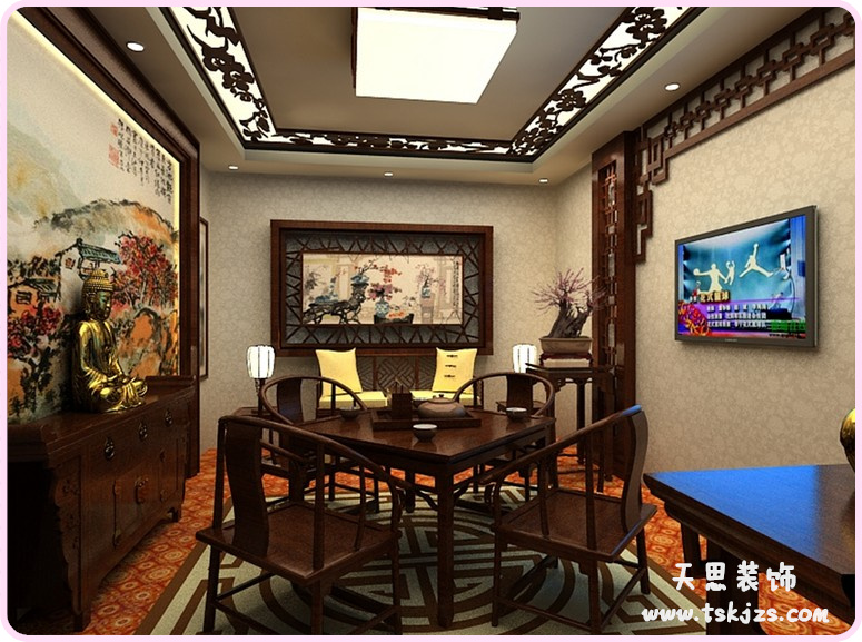 1.將錯(cuò)層式廳完分成兩個(gè)部分,臺(tái)階上用清式太師椅、案幾、杠凳、木格花書(shū)柜攔干等構(gòu)成清代風(fēng)俗的書(shū)房。