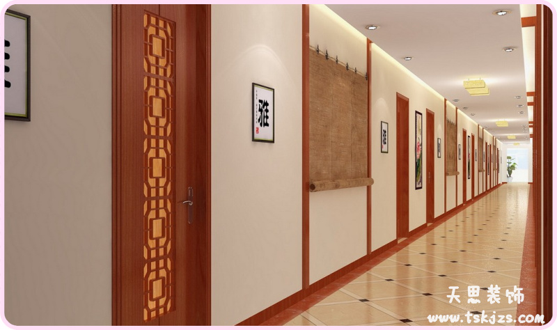 走廊是室內(nèi)流通空間的主要部分,其空間特點是狹長,且缺少變化,人在這種空間中容易產(chǎn)生單調(diào)感。因此,在設(shè)計上應(yīng)做一定的藝術(shù)處理。使其既不能過于華麗、復(fù)雜,也不宜過于簡單、呆板、應(yīng)在墻壁上做一定的裝飾點綴。如做出口線、偏倚柱、外門套和墻壁裝飾線條的藝術(shù)處理,以及字畫或燈光的點綴。在特殊功能區(qū)的路段,可以做色彩變化或不同的裝飾處理,從而形成 統(tǒng)一中有變化的視覺效果。在通常情況下,走廊的設(shè)計要求是:應(yīng)有充足的光照度、統(tǒng)一和諧的界面裝飾,清新淡雅的色調(diào)和明確的導(dǎo)向指示。
