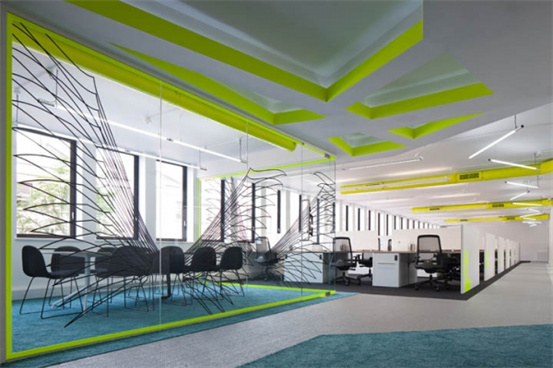 時尚辦公室裝修設(shè)計(jì):以白色為空間主調(diào),加入充滿活力的顏色,如霓虹黃色頂面線槽、以及柔軟的綠松石色地毯點(diǎn)綴在灰與黑色地毯間。裸露的頂面管道噴涂以同樣的黃色;每一組工位都以醒目的霓虹黃色字母加以標(biāo)識。空間的其它色彩以中性色加以調(diào)和,以免跳躍的霓虹黃色太過強(qiáng)烈刺激。會議室的玻璃隔墻,上面繪制了一系列的天使(Angel)翅膀圖形,為密集的辦公區(qū)增添了豐富的視覺效果。休閑區(qū)與辦公區(qū)之間一道纏繞于金屬管道之間的紅色Z字型隔屏,活躍了空間色彩。設(shè)計(jì)師以清新簡約的空間配色,打造了一個開敞明亮、且獨(dú)具個性特色的時尚辦公室。
