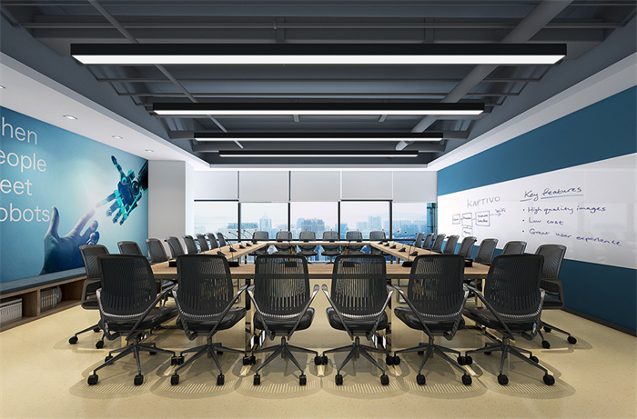 2、該辦公室裝修項(xiàng)目主要是使用者作為科技類產(chǎn)品的研發(fā)空間,要求足夠?qū)挸?,空間的開放度與靈活度自由變換,辦公桌實(shí)現(xiàn)可隨意拼裝組合。設(shè)計(jì)師在設(shè)計(jì)上立足于;靈活共享的主線,以設(shè)計(jì)、現(xiàn)代、開放和連通為主題,著眼于科技發(fā)展的今天和未來(lái),創(chuàng)造出一個(gè)極富時(shí)代感和超前性的辦公空間。整個(gè)辦公空間以白色為基底色,輔以藍(lán)色的協(xié)調(diào)、中和,黑、 白、藍(lán)成為標(biāo)準(zhǔn)層的主色系,完美將辦公層的空間格局進(jìn)行分割,營(yíng)造出現(xiàn)代簡(jiǎn)約、自由開放的高端科技感。長(zhǎng)方形燈具應(yīng)用突出了現(xiàn)代科技的嚴(yán)謹(jǐn)態(tài)度,極大凸顯企業(yè)的文化感與產(chǎn)品前沿的設(shè)計(jì)感。會(huì)議室根據(jù)實(shí)際需求,實(shí)際軟裝時(shí)則以多彩元素為主題,一眼望去 ,布滿了明快的顏色 ,活潑卻不繁雜 ,采用的半透明亞克力玻璃椅是點(diǎn)睛之筆,帶給空間無(wú)限的靈動(dòng)感。黑板漆墻面設(shè)計(jì)則豐富了使用者的功能需求,達(dá)到裝飾和功能并存的目的。靈活的辦公桌還可自由變換,滿足不同需求的會(huì)議要求。