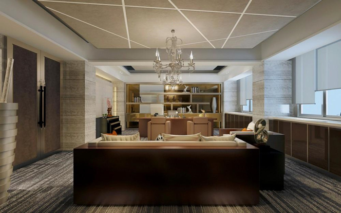 3、有質(zhì)感的辦公室設(shè)計(jì):設(shè)計(jì)師通過(guò)簡(jiǎn)化前臺(tái)裝飾元素來(lái)凸顯簡(jiǎn)介的企業(yè)標(biāo)識(shí),讓綠植承載的環(huán)保元素更加醒目,同時(shí)也強(qiáng)調(diào)了企業(yè)的科技感。在設(shè)計(jì)前方接待區(qū)的時(shí)候,充分運(yùn)用了自然色+燈光的組合來(lái)強(qiáng)化企業(yè)內(nèi)涵體驗(yàn)。沙發(fā)、地毯、茶幾與落地?zé)粼陂_放的空間里構(gòu)建了一個(gè)心理上私密的會(huì)客區(qū)域,具有濃濃的現(xiàn)代科技?xì)庀?。將空間劃分為辦公區(qū)域、交流區(qū)域、展示區(qū)域,在設(shè)計(jì)師看來(lái)總經(jīng)理辦公室相當(dāng)于一個(gè)小型的迷你辦公室,既要具備多重功能,又要做到空間內(nèi)部的辦公與配套系統(tǒng)的完整與契合。通過(guò)地毯、精選的辦公桌椅,并且結(jié)合不同區(qū)域燈光的變化讓辦公空間具有層次感。