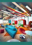 辦公室裝修主題色彩設(shè)計,辦公室設(shè)計主題就是色彩,長長的彩條作為照明器具縱橫于天花板上,彌補(bǔ)了大面積裸露天花板的空缺,家具色彩的搭配和長長的彩條相呼應(yīng),整個辦公空間色彩鮮
