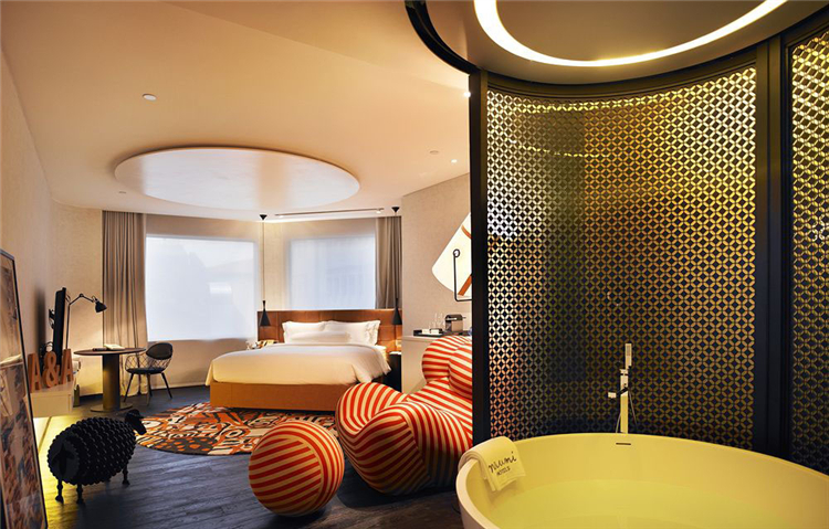 極簡(jiǎn)主義風(fēng)格并沒(méi)有妨礙設(shè)計(jì)師為酒店創(chuàng)造豐富的主題元素,以花草、猴子、孔雀、青蛙等為主題的森林圖案,遍布鏡面、墻壁等區(qū)域,營(yíng)造了精致的“城市森林”效果。