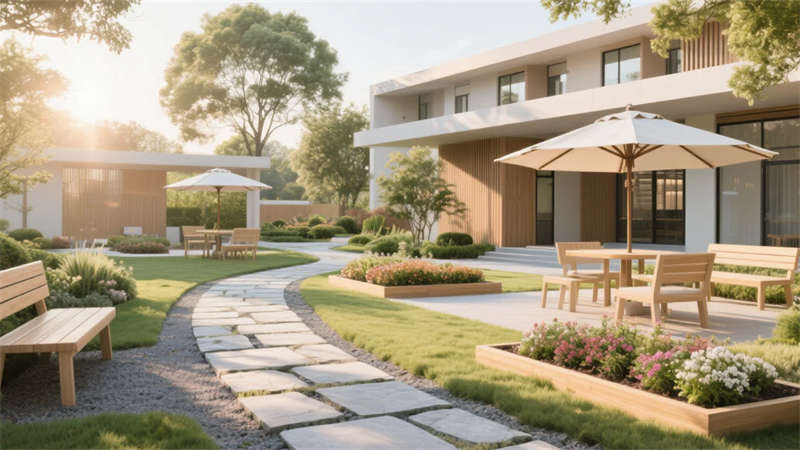 這套老年康養(yǎng)中心設(shè)計以現(xiàn)代簡約風(fēng)格為核心,營造一個溫馨、安全且充滿活力的生活空間。設(shè)計強調(diào)自然光與柔和色彩的融合,入口大廳以開闊布局和藝術(shù)元素傳遞家的溫暖,休息區(qū)則通過舒適沙發(fā)和綠植打造社交港灣。餐廳和活動室注重功能性,淺色調(diào)家具與靈活布局鼓勵日?;?,促進社區(qū)歸屬感。居住單元采用圓角細節(jié)和私密氛圍,確保舒適休憩??祻?fù)訓(xùn)練區(qū)融入防滑設(shè)計和自然光,支持健康活動。戶外庭院成為心靈綠洲,石板步道與花壇提供寧靜放松。多功能廳則適應(yīng)多樣需求,增強空間活力。整體設(shè)計以適老化理念貫穿,避免繁雜裝飾,突出簡約美學(xué)與人性關(guān)懷,讓每位長者感受到尊重與陪伴,在簡約中體驗生活的美好。