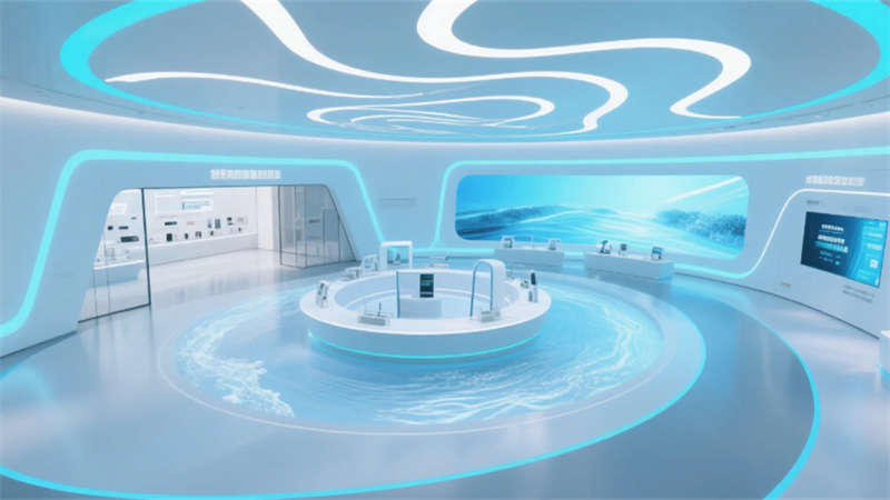 展廳以環(huán)形動(dòng)線串聯(lián)六大核心模塊:入口10米寬LED水幕墻動(dòng)態(tài)演繹凈水原理;中央懸浮式產(chǎn)品矩陣展臺(tái),通過全息投影拆解RO膜過濾技術(shù);實(shí)景化場景區(qū)1:1復(fù)刻家庭廚房、商務(wù)辦公樓及工業(yè)廠房,搭配交互式水質(zhì)監(jiān)測實(shí)驗(yàn)臺(tái);獨(dú)創(chuàng)的“虛擬管家”AR系統(tǒng),可生成個(gè)性化凈水方案并投射至合肥典型戶型模型。空間頂部采用參數(shù)化設(shè)計(jì)的波浪形燈網(wǎng),象征長江與淮河水系交匯,地面嵌入城市節(jié)水?dāng)?shù)據(jù)可視化地磚,凸顯本土環(huán)保責(zé)任感。