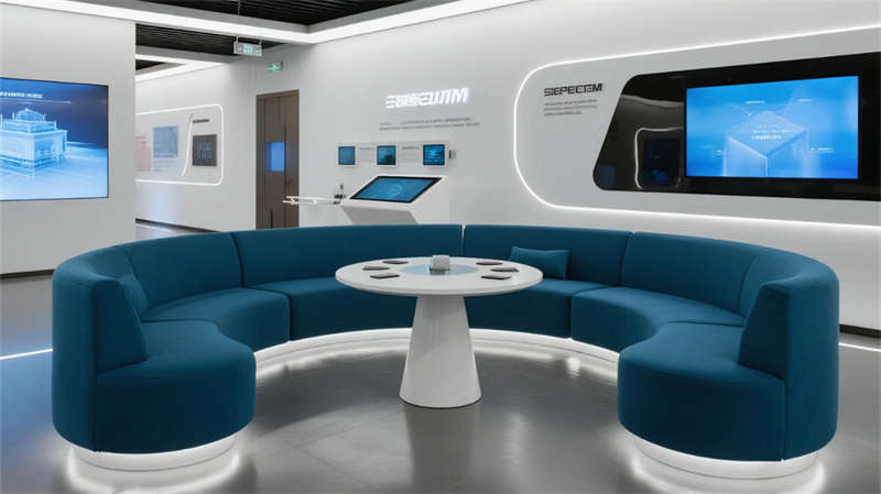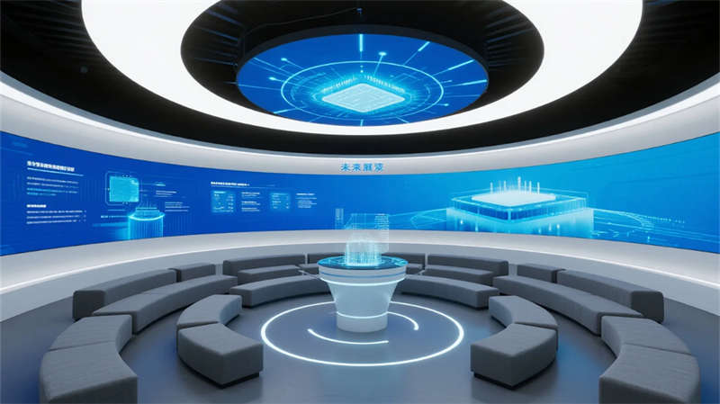該半導(dǎo)體企業(yè)展廳以現(xiàn)代簡約風(fēng)格為核心,通過流暢空間布局與高科技元素,打造沉浸式科技體驗(yàn)。設(shè)計(jì)突出半導(dǎo)體技術(shù)的抽象表達(dá),利用藍(lán)色與灰色調(diào)營造冷靜、專業(yè)的氛圍,同時(shí)融入玻璃、金屬材質(zhì)增強(qiáng)通透感。入口區(qū)以懸浮雕塑引導(dǎo)視線,產(chǎn)品展示區(qū)通過簡約玻璃柜和觸屏互動,生動呈現(xiàn)技術(shù)精髓;技術(shù)創(chuàng)新墻以動態(tài)圖文展現(xiàn)工藝演進(jìn),歷史廊道則以線性敘事喚起行業(yè)記憶?;訁^(qū)和未來展望區(qū)強(qiáng)調(diào)參與性,采用環(huán)形屏幕與全息投影,讓訪客直觀感受創(chuàng)新應(yīng)用。休息區(qū)與演講區(qū)注重人性化,簡約家具結(jié)合微光紋理,提供舒適交流空間。整體設(shè)計(jì)摒棄繁復(fù)裝飾,以干凈線條和光影變化強(qiáng)化空間流動性,不僅傳遞半導(dǎo)體領(lǐng)域的精密與前瞻性,更通過美學(xué)融合提升教育性和觀賞性。展廳作為科技展示平臺,旨在激發(fā)探索興趣,體現(xiàn)企業(yè)對創(chuàng)新文化的重視。